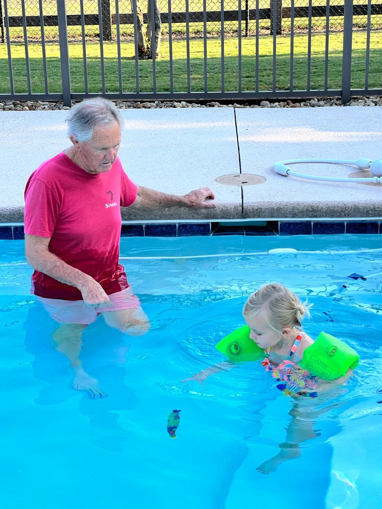 After “fixing” the camper in Louisiana, we were able to travel eastward and ended up staying one more night in a Selma, AL hotel before descending into the sweet embrace of grandparents and a pool. It was about 17 seconds after we arrived that Olive was in Papa’s pool and back to glee.